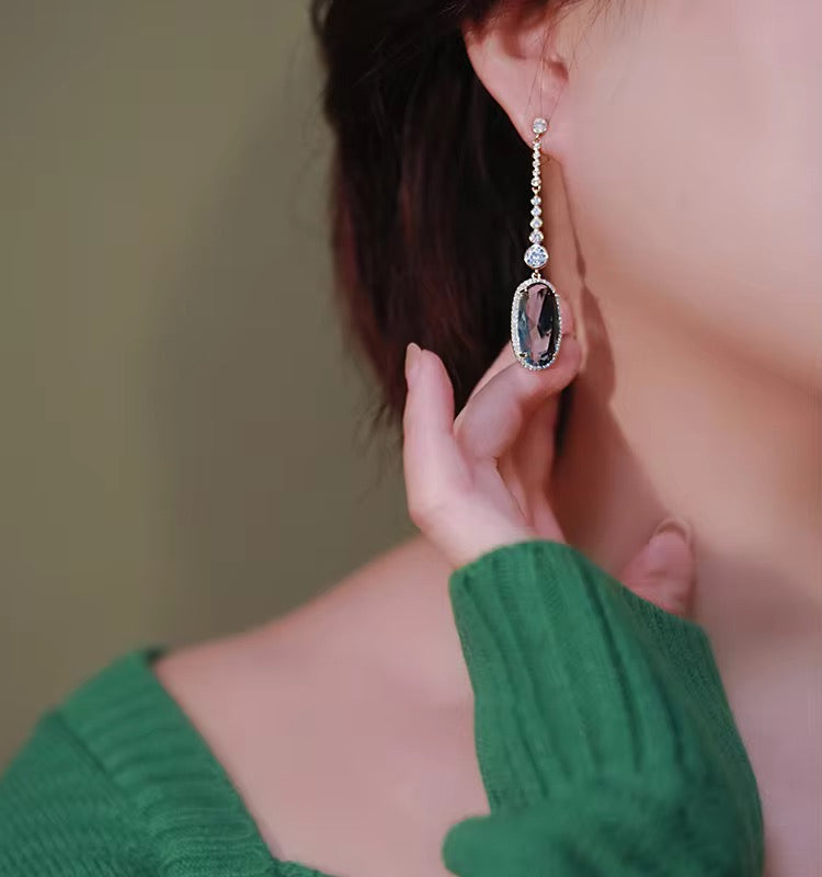 Make a bold yet elegant statement with these Romantic Oval Cut Long Drop Earrings for Women, adorned with a stunning sky blue crystal centrepiece and brilliant white cubic zirconia stones along the vertical pendant line.